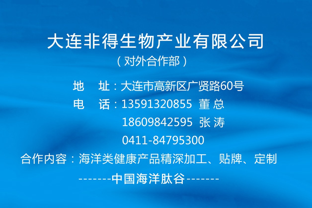 大连非得生物产业有限公司成立于1999年,注册资本8000万元,位于大连市金普新区,是一家专业致力于海洋活性功能产品研发、生产、销售、服务于一体的高新技术企业。非得公司于1999年率先在国内进行了海洋肽保健食品的研发生产。经过20多年的发展,现已成为国内知名的海洋肽产品研发和生产基地,被誉为“海洋肽谷”。